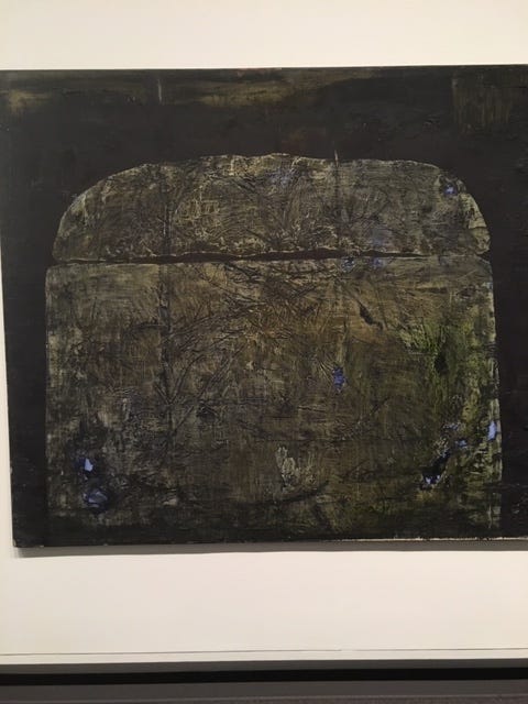 The piece stopped me in my tracks. It is dark, and yet light. Imposing and compelling. Daunting and delightful. And when I saw it was called Guano (Menhir), I loved it even more. (Guano is the Spanish word for the bat and bird shit that accumulates over time in a single space.) The work is by French artist Judit Reigl, and was created between 1959 and 1964. Reigl was working in a new studio then, and in an effort to protect the floor, she covered it with rejected canvasses. Over the following years, the canvasses became saturated with paint and other material as Reigl worked and walked on top of them. As detailed in the gallery description next to the painting, Reigl noticed that, as she puts it “these excremental rags slowly became stratified layers, like the guano (bird dung) that comes from the isles of Latin America.” She took the rags, and used a homemade tool to scrape through the layers to “excavate” the “painting” that now hangs in the Metropolitan Museum of Art.